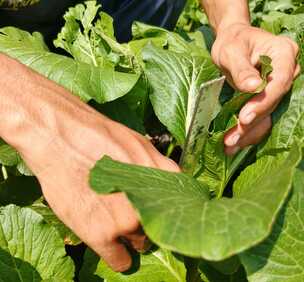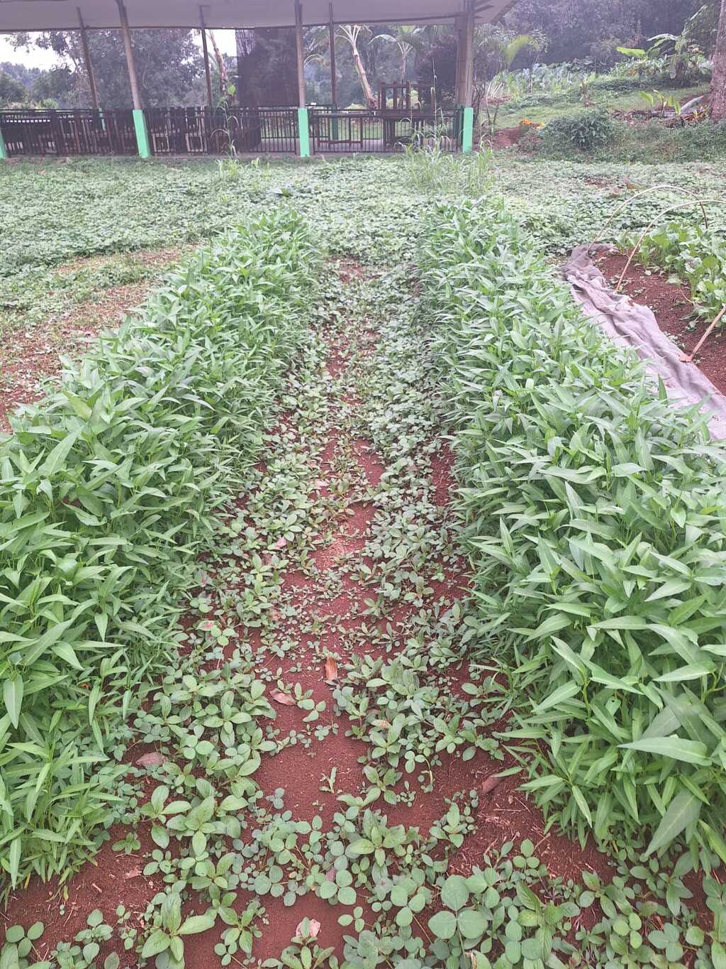 Perawatan Caisin (Brassica chinensis var. parachinensis) di kebun sayur PT. Suryo Riset Indonesia melalui penyiraman rutin setiap harinya