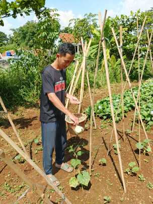 Perawatan Timun (Cucumis sativus) di kebun sayur PT. Suryo Riset Indonesia melalui penyiraman rutin setiap harinya