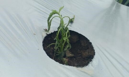 Tanaman yang tidak menggunakan PGPR tampak layu, dengan daun melengkung sebagai indikasi stres dan kurangnya nutrisi.